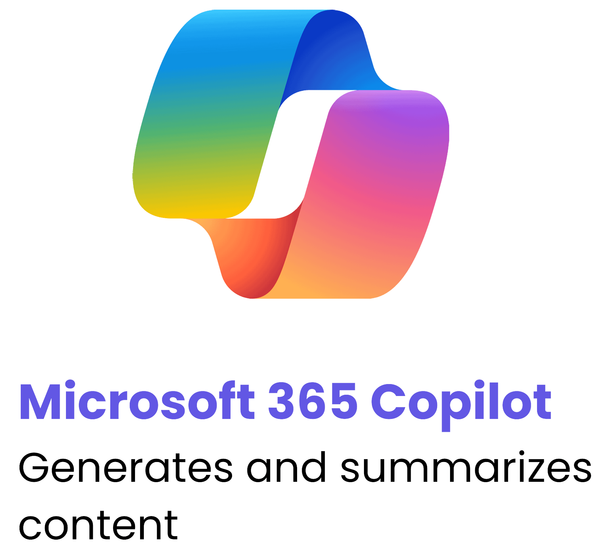 Microsoft 365 Copilot: Generative AI. Used for content creation, summarization and enhancing individual productivity. Used with tools like Word, Excel, Outlook and Teams.