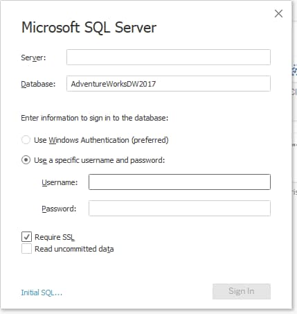 To begin testing Tableau’s AI features, we’ll first connect to the Azure SQL database, providing standard database connection information.
