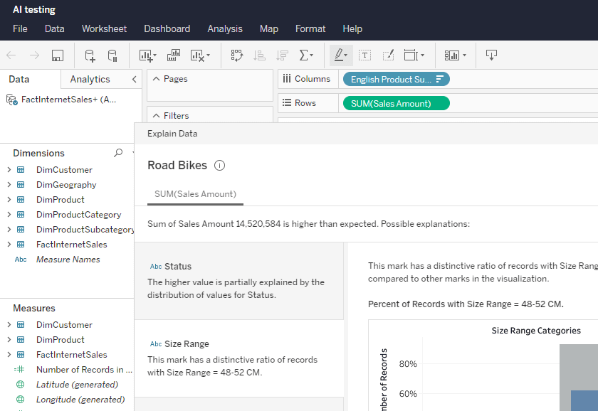 Pros: Explaining a data mark to a user using AI seems useful and intuitive as analysts are already used to using tooltips and selecting marks. Live queries are supported (but fairly slow), extracted data is performant.