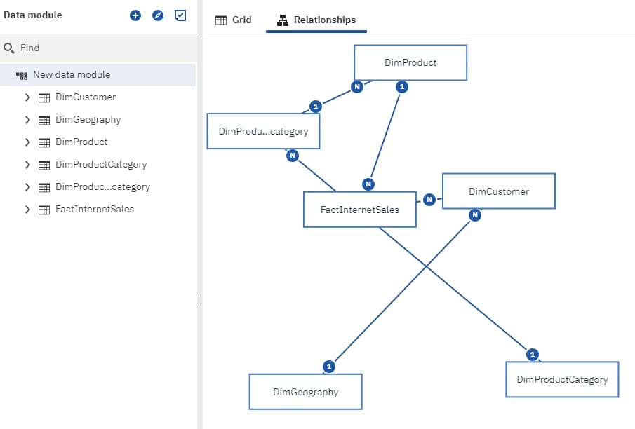 As part of building the data module, you select the desired tables. Like the other BI tools tested, relationships are detected and diagramming is supported.