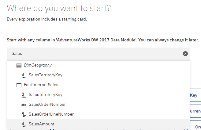 We are then prompted to pick a metric with which to start our exploration. As is the other test examples, we will pick SalesAmount using the nice autocomplete list.