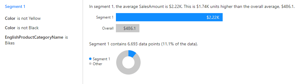 This process is very ad hoc; some dimensions uncover new insights while some do not change the results at all. We tested a series of different columns, bringing them into the Explain by area to see what changed, if anything. Insights were a mixed bag of beneficial and those lacking common sense and therefore unhelpful.