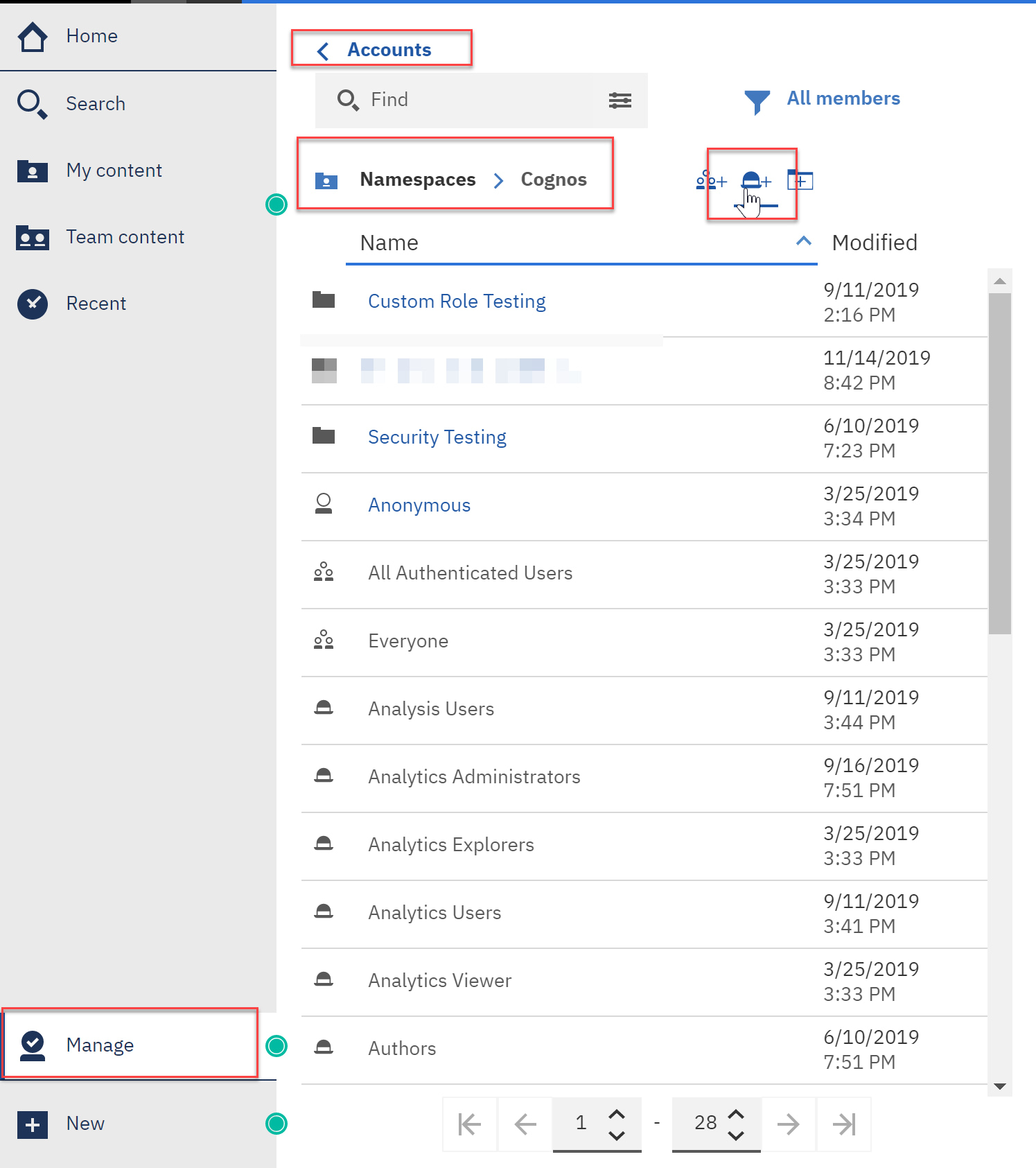 - Select the Cognos Namespace (Namespaces > Cognos).
