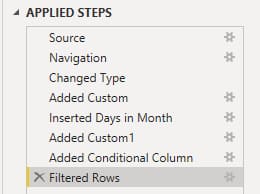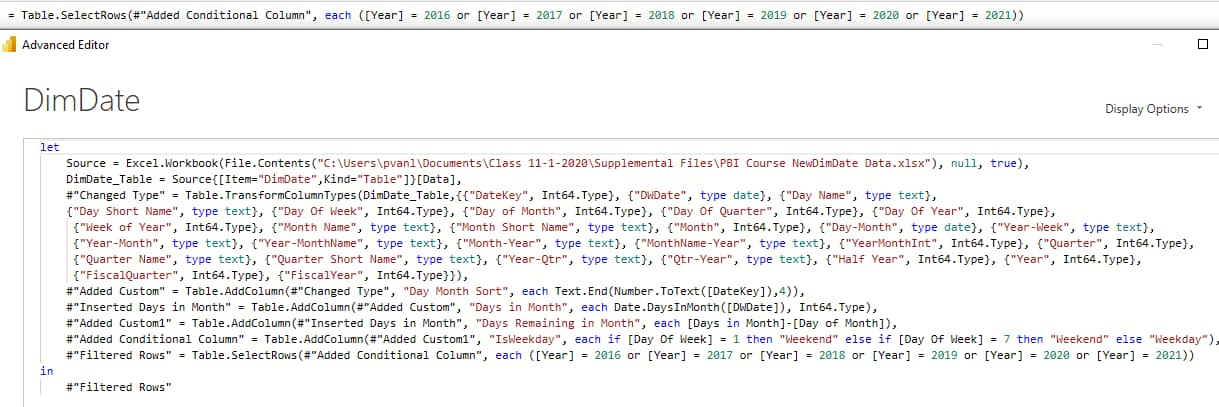 - Advanced Editor feature – The Advanced Editor in Power BI Desktop lets you view—and then easily add to or modify—the underlying M code used to perform transformations. Below is an example of the Power Query code used to build a custom column called “Is Weekday.” It shows the resulting M code displayed in the Advanced Editor.