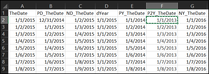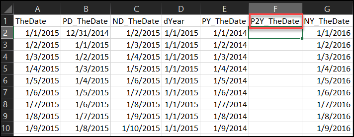 - Populate all the rows in this column with a date that is 2 years prior to the TheDate. For example, the first row has 1/1/1990 as the TheDate value; therefore, the value of the P2Y_TheDate column should be 1/1/1988.
