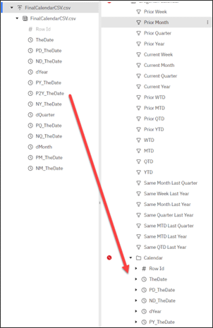 - Add the new P2Y_TheDate column to the data module’s list of fields. This allows us to create a new filter. To do so, drag the source CSV file to the top root of the data module. The fields will be refreshed and the new column will be added to the bottom of the list.
