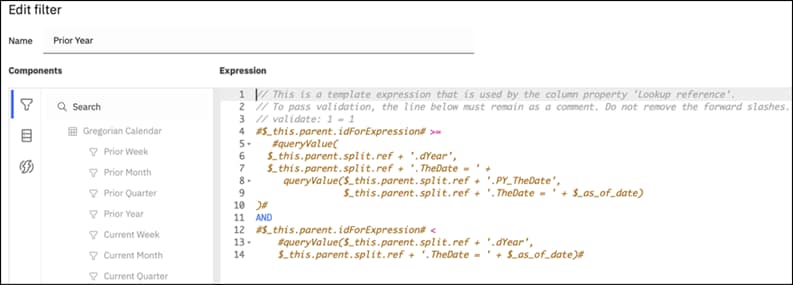 When adding new filter calculations, it is best to look at existing filter calculations to understand the existing syntax and logic. The Prior Year filter calculation is the most similar to what we are trying to accomplish. The filter calculation is shown below.