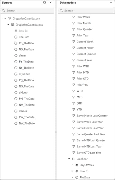 To enable relative date analysis in Cognos Analytics, link a supplied Gregorian or Fiscal calendar data module into an existing data module. From there you can easily create measures and filters that automatically produce the relative time analyses shown in the image on the right. (Watch our on demand webinar to see how to implement the initial configuration.)