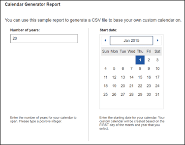 - Supply the Number of years and a Start date. In the example below, we show running a calendar for 20 years.