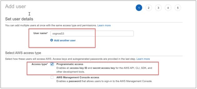 - The first thing we need to do is setup Identity and Access Management (IAM) in AWS. We want to create a new user to connect Cognos and my AWS S3 bucket (which we will create next).