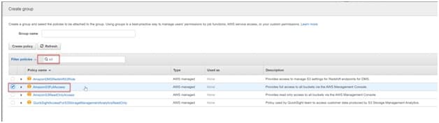 - The user needs to be part of the S3 Full Access group, so add the user to the group on the next page.