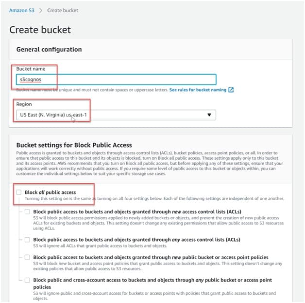 - Finally, let’s create a new bucket in S3 to store our Cognos reports. Give it a name, define your region and uncheck the box to Block all public access (we can come back and lock things down later if needed).