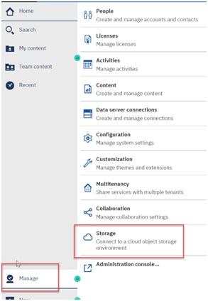 - We are done on the AWS side, let’s now setup the connection in Cognos. To do so, you need to be an administrator with access to the Manage button. From here you should see a new option (if you are on 11.1.5 or later) called Storage.