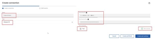 - Give the new connection a name (we named ours CognosOutput), select the type (Amazon S3 is what we are using) and finally the Access Key and Secret Key we received when we created out account. Click the Test button to verify we are able to connect. If you are successful, click the Create and continue button. If not, make sure your keys are correct and that the user is part of the S3FullAccessGroup.