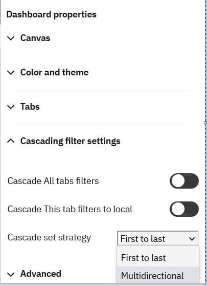 Finally! 11.2.3 includes lots of options and ways to do Cascading filters, from All Tabs to Current tab as well as custom cascade grouping. A staple of Cognos reporting is now available in Dashboard properties.