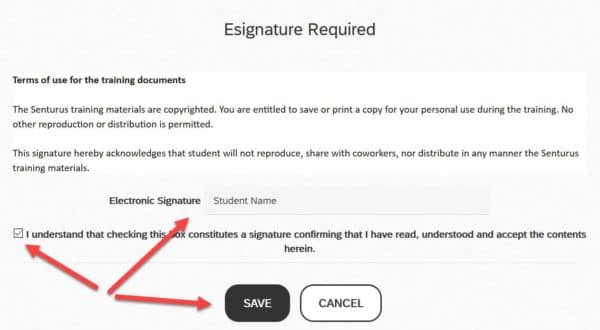 - Type your name, check the box confirming your signature, then click Save.