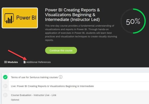 - Click Start this course or Terms of use for Senturus training courses.